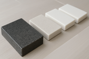 Valued for its seamless appearance and design flexibility, Solid Surface (like Corian) is a premium composite material that can be joined invisibly. It can be thermoformed into curves and even integrated with a seamless sink for a modern, monolithic look